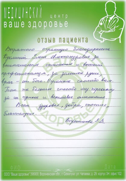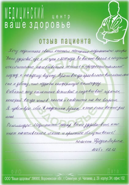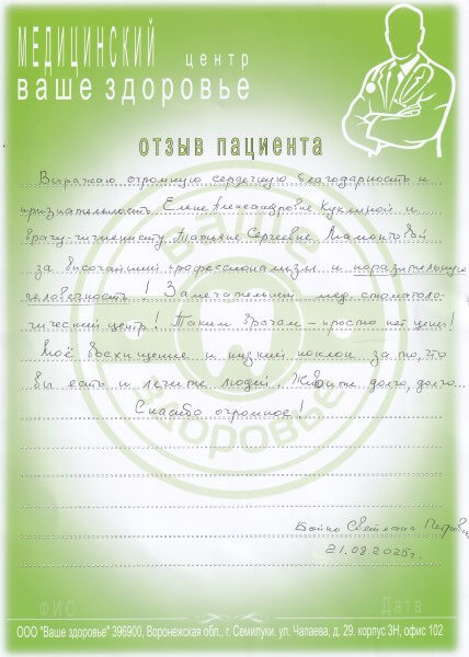 Я, Скрынникова Св. Ив., хочу выразить благодарность коллективу МЦ ООО "Ваше Здоровье" за отличное обслуживание, внимательность, теплоту отношений.