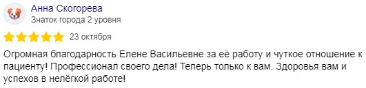 Особую благодарность хочу выразить своему лечащему врачу Безрукавой Елене Васильевне за ее профессионализм и качество работы, все 2 приема по 2.5 часа пролетели весело и незаметно, было очень приятно находиться на приеме, теперь буду обращаться в вашу клинику.