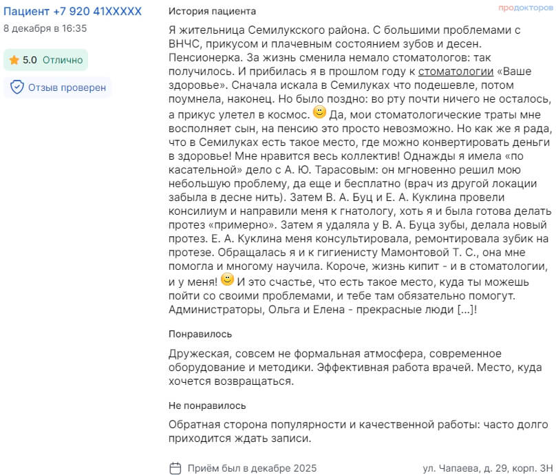 Обращаться в «Ваше здоровье» не хотел, думал, что тоже самое получу в поликлинике и не за большие деньги. По совету матери обратился в «Ваше здоровье» — я в шоке, денег за такую работу ни капли не жалко, сделано все по высшему уровню. Запись на прием в удобное для меня время, если приходится подождать, то не более 10 минут, режим работы лучше не придумаешь. По окончании лечения часть потраченных денег вернуть не проблема через налоговую (не знаю, как правильно называется эта процедура) но все рекомендации по документам, пожалуйста, нет проблем. ПРОСТО СУПЕР ВСЕ ВЫСШИЙ КЛАСС.