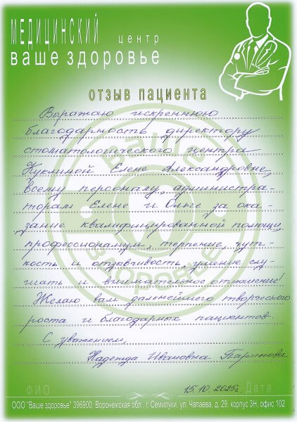 Уже более десяти лет наша семья пользуется услугами медицинского центра "Ваше здоровье". Приятно посещать эту клинику: вежливые администраторы, комфортная обстановка, прекрасно оснащённые кабинеты и главное - грамотные специалисты. Особая благодарность Куклиной Елене Александровне, замечательному доктору с большим опытом и высокой квалификацией, за чуткость, доброжелательность, профессионализм. А также врачу - гигиенисту Мамонтовой Татьяне Сергеевне за аккуратность, внимательность, готовность дать полезные советы и рекомендации. Хочу пожелать коллективу центра крепкого здоровья, семейного благополучия и благодарных пациентов. Рекомендую всем вашу клинику и врачей. Большое вам спасибо!