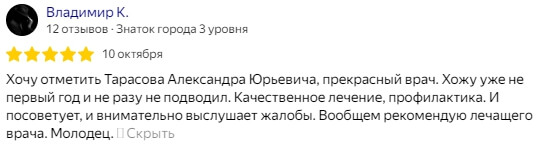 Хочу выразить огромную благодарность замечательному врачу Тарасову Александру Юрьевичу за его высокий професионализм и терпеливое отношение к пациентам. Я очень довольна, что выбрала Вашу стоматологию "Ваше здоровье" и именно этого доктора. Спасибо большое!