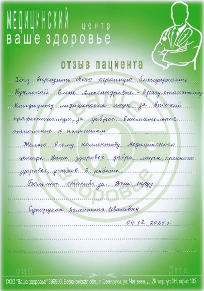 Уже более десяти лет наша семья пользуется услугами медицинского центра "Ваше здоровье". Приятно посещать эту клинику: вежливые администраторы, комфортная обстановка, прекрасно оснащённые кабинеты и главное - грамотные специалисты. Особая благодарность Куклиной Елене Александровне, замечательному доктору с большим опытом и высокой квалификацией, за чуткость, доброжелательность, профессионализм. А также врачу - гигиенисту Мамонтовой Татьяне Сергеевне за аккуратность, внимательность, готовность дать полезные советы и рекомендации. Хочу пожелать коллективу центра крепкого здоровья, семейного благополучия и благодарных пациентов. Рекомендую всем вашу клинику и врачей. Большое вам спасибо!