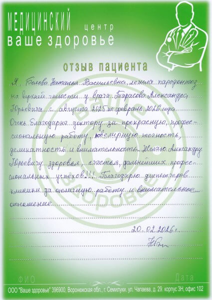 Обращаться в «Ваше здоровье» не хотел, думал, что тоже самое получу в поликлинике и не за большие деньги. По совету матери обратился в «Ваше здоровье» — я в шоке, денег за такую работу ни капли не жалко, сделано все по высшему уровню. Запись на прием в удобное для меня время, если приходится подождать, то не более 10 минут, режим работы лучше не придумаешь. По окончании лечения часть потраченных денег вернуть не проблема через налоговую (не знаю, как правильно называется эта процедура) но все рекомендации по документам, пожалуйста, нет проблем. ПРОСТО СУПЕР ВСЕ ВЫСШИЙ КЛАСС.