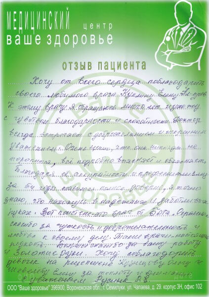 Я, Скрынникова Св. Ив., хочу выразить благодарность коллективу МЦ ООО "Ваше Здоровье" за отличное обслуживание, внимательность, теплоту отношений.